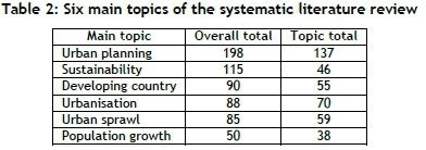 Table 2 identifies the six most discussed topics that were found in the SLR. The topics that coincide with the search criteria are urban planning, sustainability, and developing country. Therefore, the topics that are of importance from the SLR are urbanisation, urban sprawl, and population growth. It is evident that these three phenomena are dependent on one another. For example, population growth leads to urbanisation as people need to survive, and cities have all the services and resources. This combination leads to rapid expansion, causing urban sprawl, along with all its negative impacts. To mitigate the problems caused by urban sprawl, urban planners need to resist these anti-development phenomena. Adaption methods and techniques must first be incorporated to manage the current issues. Then the new plans must develop a resilient structure to combat these changes as they arise. It is more important than ever for urban planners to use technology to predict these rapidly changing trends and to enhance the sustainability of cities in developing countries. It is known that developing countries lack data and specialised personnel. But, with this research, the hope is that a foundation can begin to be laid with the latest effective technology.
