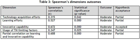From the qualitative study, it was noted that technology acquisition was associated with building capabilities within the organisation. Combining this with technology acquisition efforts from the Spearman calculations confirms that the following should be accepted: