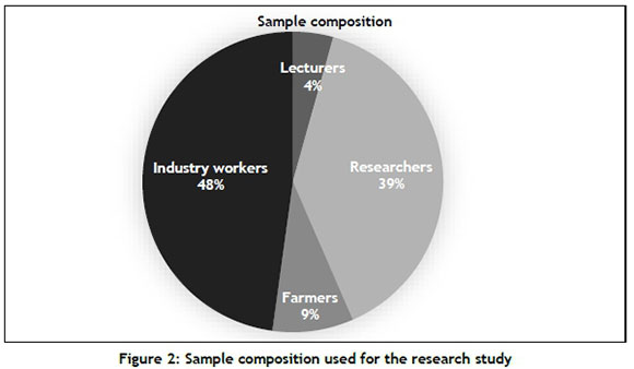 The sample was dominated by industry workers (48 per cent), as shown in Error! Reference source not found. below. Farmers constituted nine per cent of the sample, while 39 per cent of the respondents were researchers in the field of agriculture.