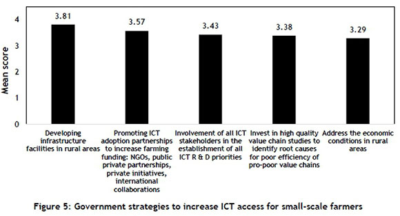 Figure 5 shows the results of the rankings of the government strategies that are required in order to address the challenges of ICT adoption by small-scale farmers in rural areas. The respondents ranked the development of infrastructure facilities in rural areas as the most important focus area for government, with a mean score of 3.81. The second-highest rated strategy (with a mean score of 3.57) is the promotion of ICT adoption partnerships to increase farming funds. Respondents also believed that involving all ICT stakeholders in the establishment of all ICT R&D priorities was important.