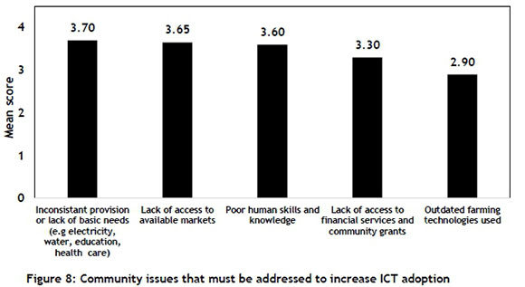 The inconsistent provision, or lack, of basic needs was ranked as the highest priority, with a mean score of 3.70. Respondents believed that this is the most important community issue that must be addressed to increase the adoption and uptake of ICTs by small-scale farmers in pro-poor value chains. The focus area with the second-highest ranked priority is the lack of access to available markets, as shown in Figure 8.
