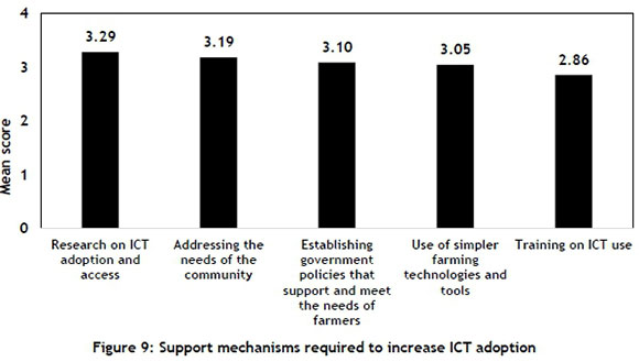 The most important support mechanism for ICT adoption is research on ICT access and adoption, with a mean score of 3.29, as shown in Figure 9. Participants also believed that addressing basic community needs in pro-poor value chains was the second most important support mechanism (with an overall mean score of 3.19). The results showed that the need to establish government policies that support and meet the needs of small-scale farmers in pro-poor value chains was the third most important support mechanism to explore.