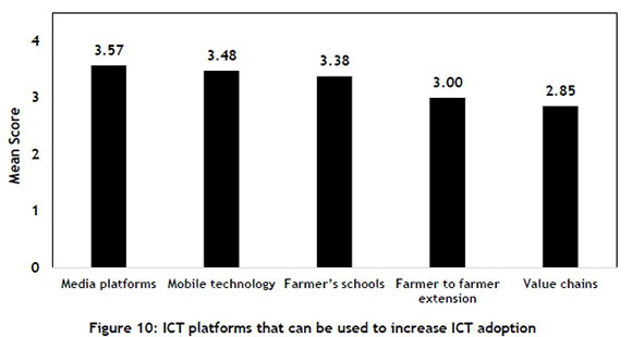 Media platforms were deemed to be the most effective ICT platforms to improve farming methods in rural areas, as shown in Figure 10. This received the highest mean rank of 3.57 out of 5. The second-highest ranked ICT platform was mobile technology, followed by farmers' schools, with mean scores of 3.48 and 3.38 respectively. The lowest rating was given to the establishment of value chains.