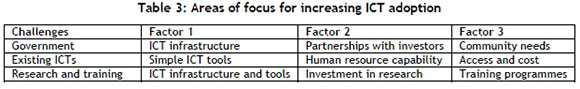 The results further point to the need to expose small-scale farmers to current and simple ICT tools that will develop their farming businesses. Stakeholders are required to invest in ICTs in rural areas. The areas of focus that were highlighted from the research results are shown in Table 3.