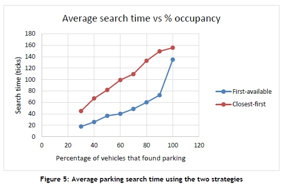 As already mentioned, the aim was to compare the effectiveness of two parking strategies under varying conditions. Figure 5 shows the comparison of the average time taken to find parking under varying parking lot occupancy conditions using the two strategies.