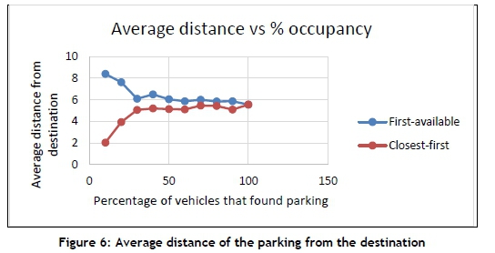 Another important measure of the effectiveness of the two strategies is the average distance from the destination at which parking is found. Figure 6 shows a comparison of the strategies in this regard.
