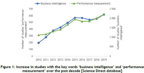 Figure 1 below shows a 99 per cent increase in studies with the key words 'business intelligence', and a 212 per cent increase in studies with the key words 'performance measurement' over the past decade. This supports the expected increase in reporting.