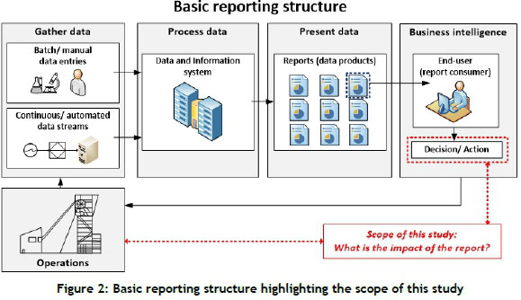 Mesaros et al. [1] highlight the importance of BI systems for quantitative measures such as business cost and profit. So the extent of the impact of operational reporting on operations need to be comprehensively assessed by considering both qualitative and quantitative measures. Figure 2 highlights the scope of this study in a basic reporting structure.