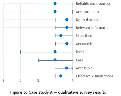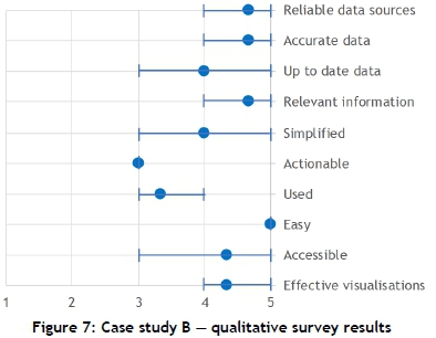 To test the functionality of the survey, it was sent to selected main end-users - three project engineers. The qualitative survey results are shown in Figure 5, with the minimum and maximum indicated. The results show that the qualitative factors are rated high by report users. The survey questions were derived from the SLR (listed in Table 1).