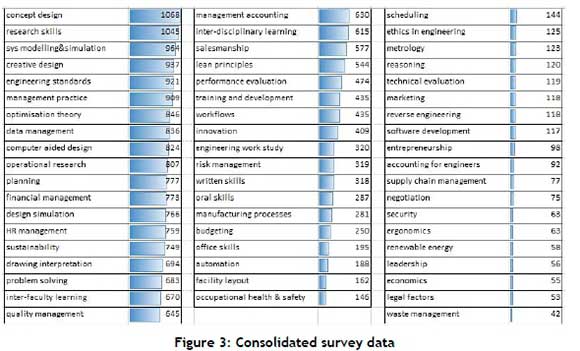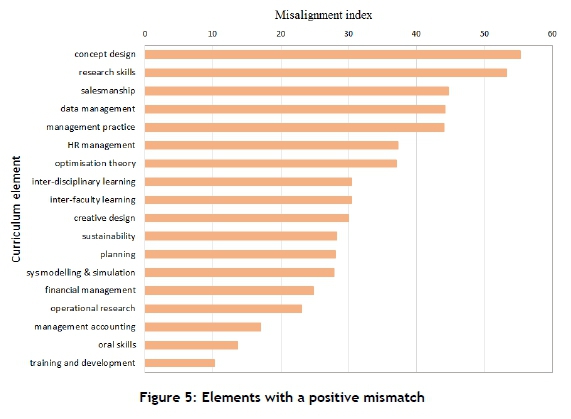 Figure 3 depicts the needs of the industry. The idea is to be able to manipulate the curriculum to address these needs proportionately. The top curriculum element is 'concept design'; accordingly, the explanation is that a critical demand of industrial engineering is that the incumbent can develop systems, processes, standards, and specifications for various purposes. This requires strong competencies in understanding concepts and in designing or optimising them. Also high on the list is 'research skills' because of the diverse spread of industrial engineering job duties (from the medical field to aviation and other complex fields) - hence the need for advanced research skills in order to master unique job demands quickly and adequately. It is not practical to teach the student all the relevant material in class; so students need to learn how to learn independently. The 'system modelling and simulation' element also appears high on the list because industrial engineering work is heavily populated by tasks relating to the development or optimisation of systems, and this requires modelling and simulation; and so on.