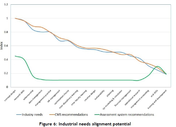 The conventional assessment system is more generic (more academic), while the proposed curriculum management system is more industry-focused. The proposed curriculum management system speaks directly to the needs of the industry in terms of skills and knowledge. The conventional assessment system, for example, will recommend design projects to address more realistic (real-life) problems; but the management system will recommend the realistic problems that need to be addressed at a topic level. A graphical analysis of the impact of either system against industry needs is required to make a comprehensive evaluation. This analysis shows the degree to which both the conventional assessment system and the curriculum management system can align curriculum with the specific skills/knowledge needs of the industry. Figure 6 presents the analysis.