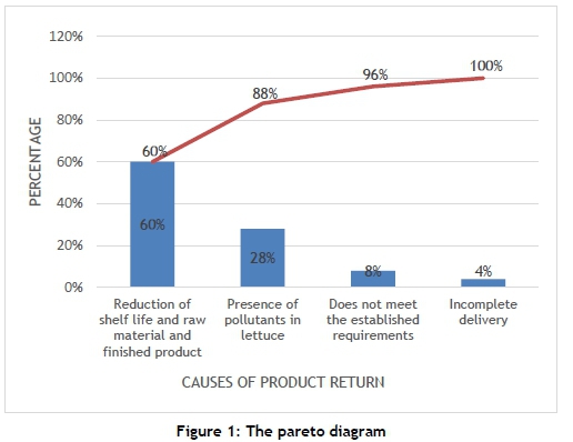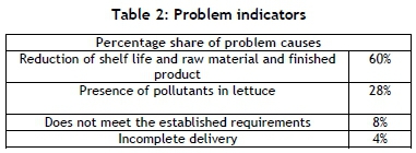 An analysis of the Pareto diagram was carried out to identify the main causes of product returns, and it was found that more than 80 per cent of the cause were the reduction in shelf life and the presence of contaminants in lettuce, as shown in Table 2. Once the main causes of the problem has been identified, the tools and/or methods that could address the causes of the identified problem were identified.