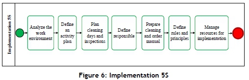 The first step in the implementation of the 5S was to analyse the work environment of each production process to identify the activities to be carried out. An activity plan was then defined based on the results of each workspace. In each identified area, a number of activities were carried out that correspond to the phases of the 5S, which include the classification of necessary and unidentified materials and/or equipment, the order of the necessary materials, and the cleaning and inspection of the materials and of their work area. Finally, the habit of activities was created until a 5S culture was established in the workers [21].