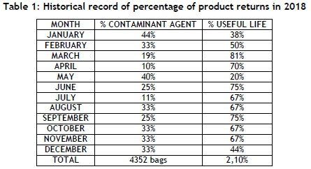 Table 1 indicates the percentage of products returned, based on the type of problem presented for each month in 2018. It can be seen that 4,352 bags of products were returned, representing 2.10 per cent of the production in that year.