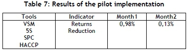 The results of the pilot implementation were satisfactory because there was an 89.2 per cent reduction in returns over the previous year; but this value was obtained only in the second month of implementation because, in month 1, workers were in the process of adapting to the new activities.
