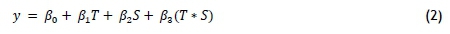 Although Equation (1) is a simple way to calculate the DID value, it is also required to calculate the p-values to determine whether these values are statistically significant. For this, ordinary least squares (OLS) regression is used, based on Equation (2) [23, 24, 25]; where y refers to the grade (either mid-year or year-end); T is a binary variable indicating whether the grade is at the start or the end of the time period (mid-year, T = 0; year-end, T = 1); S is a binary variable indicating whether the student received treatment (no-videos, S = 0; videos, S = 1). Finally, T * S is an interaction variable. In terms of the coefficients, ß0refers to the control group's initial grade; ß1indicates how much the control group changes grades over the time span of the intervention; ß2is the difference between the initial grade of the treatment group and control group; and ß3is the DID coefficient value, which can be used to estimate the prediction of the treatment effect.