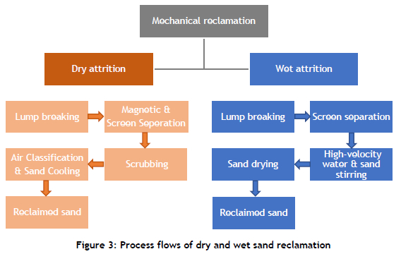 There are two types of mechanical reclamation methods - namely, dry and wet attrition, as depicted in Figure 3. The type of method selected will depend on the type of binder system used. Dry attrition requires, inter alia, dry sieving pans or vibrating screens, jaw crushers, and scrubbers. After the crushing and scouring, a line-removing exhaust stage is usually followed by a mechanical device that separates big particles, metallics, and other tramp materials [9].