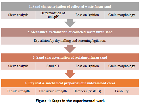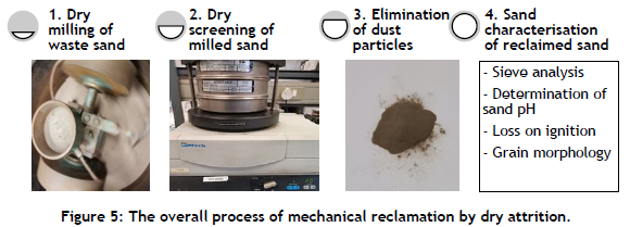 Mechanical reclamation by dry attrition was achieved by dry milling the waste sand to allow the sand grains to rub against each other, followed by dry screening to eliminate the fine resin content that might have been present as dust. Figure 5 below illustrates the overall process.
