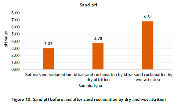 The pH results depicted in Figure 10 below showed an increase in sand pH value from 3.03 before mechanical reclamation to 3.78 and 6.81 after mechanical reclamation by dry and wet attrition respectively. These values indicated a decline in the sulphonic acid present in the sand. It can also be seen below that mechanical reclamation by wet attrition showed a drastic increase in sand pH value, proving to be more effective in removing the residual binder in the sand than mechanical reclamation by dry attrition.