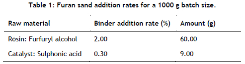 A Kenwood mixing machine was used to mix the catalyst, the reclaimed sand, and the resin for three minutes. 1000g of reclaimed sand was weighed and transferred into the mixing bowl, and the catalyst was added and mixed with the sand first to avoid the resin being in contact with high concentrations of the acidic catalyst. This was done to prevent a rapid reaction rate between the catalyst and the resin.