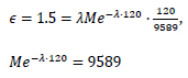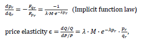 and with the average price of 120, sale quantity of 9589, and e =1.5, we solve for M and λ