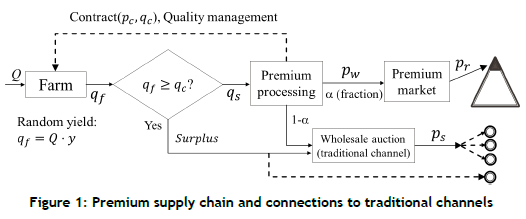 The premium channel has one stage of production and one stage of processing. Q denotes the input quantity to a farm, qf denotes the random output, where the subscript f denotes a farm or farmer, and y denotes the random yield rate. If the actual output is greater than qc, then the surplus is sold through the traditional channel in a public auction, also called the secondary market, at price ps. qs and qs = min(qf,qc) denote the actual quantity supplied to the processing stage (ripening, quality screening, packing, etc.). Since the bananas must be premium grade, we call the retail chain stores 'the premium marketplace'. We use the parameter α, 0 < α < 1 to represent the fraction of qs sent to the chain stores and use (1 - a)qs to represent the remainder sent to the traditional channel.