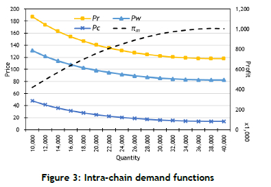 Next, we explain the other three curves. Considering that a supply chain of multiple stages is a sequence of long-term demand-supply relationships, one for each stage, we represent each relationship by a demand function or inverse demand function. All firms in each stage constitute a horizontal market - i.e., a duopoly or oligopoly - and the horizontal markets might have different market structures. If a supply chain is non-integrated, the horizontal markets are more or less independent, and in an integrated chain they are tightly coupled. Figure 3 shows the three curves representing the intra-chain demand functions from the supply chain's market end to the producer end. The premium market determines the top curve, but it is up to the integrator to decide the size of the premium market by controlling the supply. The gap between the top and middle curves equals the retailer's mark-up; high mark-ups indicate high market power. The middle curve also imposes a ceiling on the planning space for specifying the farm contract. In this space, the integrator's profit-maximising behaviour determines the OC curve at the bottom. The integrator and farmers need to settle on a specific point of the curve that suits their respective interest. The three intra-chain demand functions characterise the interactions between the stakeholders, and the spacing between the demand functions represents the prospect of profit allocation.
