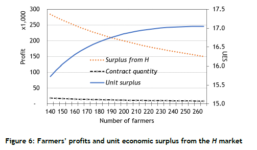 The two profit functions for the farmers are intriguing. For the H market, the farmers' nf,H is concave and does not continue to increase with the contract price, but levels off initially and then decreases slightly. The farmers' profits from serving the H market are more-or-less the same over a broad range of contract prices. In other words, the profits are not sensitive to contract price. For the L market, the farmers' nfL increases with the contract price because the quantity sold to the secondary market increases. Note that, even though the farmers reap profits from the H market, opportunities for more profits can be gained in the L market. The reason is attributable to the integrator's profit-maximising OC. All options of (pcqc) pairs generate the same profit for the integrator and leave the farmers with little room to manoeuvre. On first thought, the farmers might desire a high contract price, but in this case of an integrated chain, more profits will not result from selling to the H market but from selling the surplus - i.e., the output subtracted from the contract quantity - to the L market. The farmers can also sell their surplus output to tertiary venues. A higher contract price is accompanied by a lower contract quantity, and thus a higher surplus quantity. While the supply contract does guarantee a lump-sum profit, the surplus output is likely to be the farmer's primary concern and economic motivation.