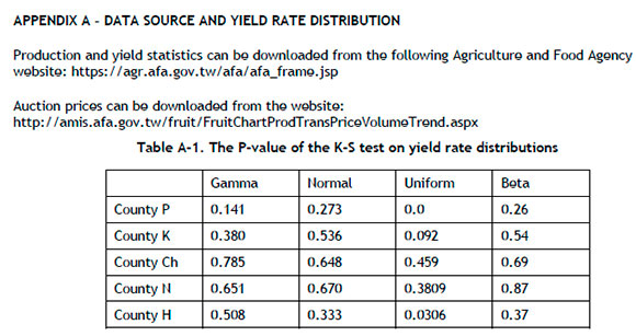Table 1 lists the results of statistical tests on the yield rate distribution for the three major counties of the five. (Table A-1 of Appendix A lists the P-value of the K-S test of the yield data of the five counties and four candidate probability distributions.)