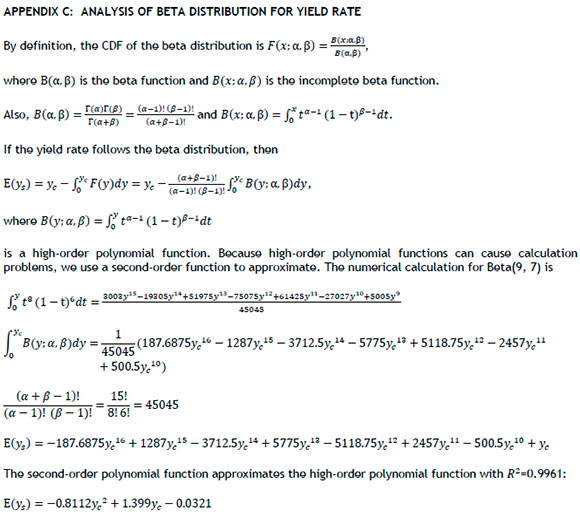In numerical example 1, the yield rate follows the beta distribution beta(9,7). The resulting formula for the E[ys] of Equation 3 will be a polynomial function of 16 degrees. Nevertheless, regression by a second-degree polynomial is a good approximation with fi2=0.9961 (see Appendix C):
