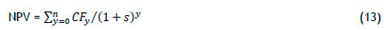 In equation (13), CF0 is the initial investment with a negative sign. There can be negative cash flows other than CF0 when there are several investments at different periods. In equation (13), y is a period when the cash flow occurred relative to the NPV evaluation date; s is a discount rate. The NPV results are interpreted as follows [8]: if the NPV is less than zero, the investor is better off without the investment; and if it is greater than zero, the investor is better off with the investment.