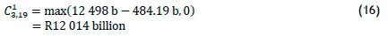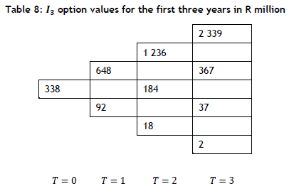 In Table 6 the value of V0 is R5.11 billion at Τ = 0, and increases to R7.71 by a factor of u or decreases to R3.39 billion by a factor of d at Τ = 1; this continues until Τ = 3. However, Table 7 shows the values of V0 for the last three years in which the three investment projects are invested (2037, 2038, and 2039).