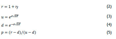 In equation (1) the years are represented by In equation (2) rf is the risk free rate. In equations (3) and (4) σ is used to determine u and d respectively, and ΔT is the time frequency [9]. In equation (4) ρ is a risk-free probability [23].