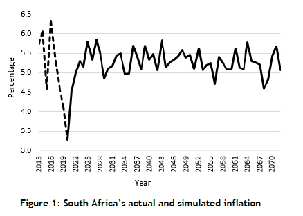 In Figure 1 the annual inflation rates from 2013 to 2020 (dotted line) are actual and the rest are simulated. The determination of the simulated annual inflation rates is discussed in Appendix A.