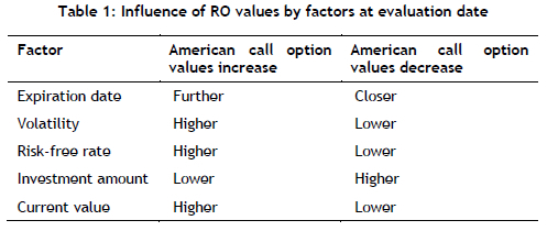 The first row of Table 1 shows that the call option value increases at the evaluation date when the expiration date is far away from the RO evaluation date; and the inverse occurs. The investment amount is the only factor that moves in the opposite direction to the call option values. The influence of factors in Table 1 is easily observed when two or more ROs are evaluated at the same evaluation date.
