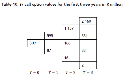 The call option values in Table 10 and Table 11 are for the I2, and are determined in section 2.2.2.