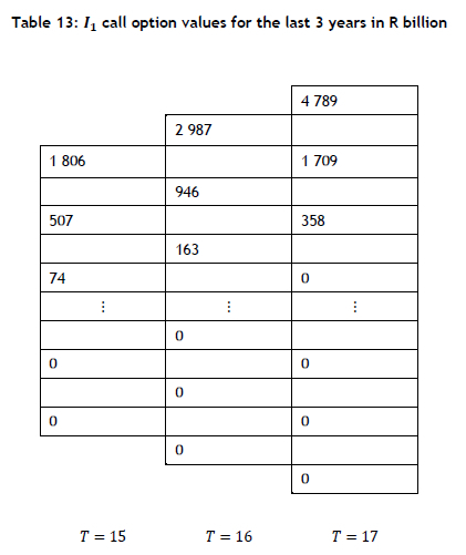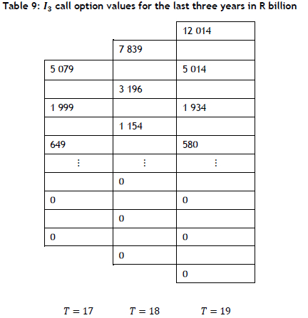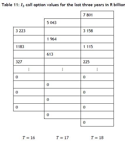 The call option values for I1 are determined from the call option values in appendix B at Τ =17 using equation (12). The option values at Τ = 16 are determined from the option values at Τ = 17 using equation (13). Similarly, the call option values at Τ = 15 are determined from the call option values at Τ = 16, and this continues iteratively until Τ = 0. The results are shown in Table 12 and Table 13.