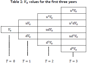 The value of V0, goes up by a factor of u and down by d each year until the last investment year [9], which is z. The up and down movements of V0 form a binomial tree [9], [22], which is in Table 2 for the first three years. The binomial tree is used because it embodies the uncertainty associated with each V0 [10]. The values of V0 are not constant, but are to be adjusted as new information emerges [10].