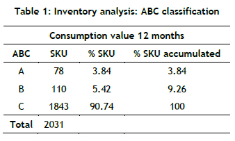 Table 1 shows that the number of products classified as 'A' and 'B' were less than 10% of the total SKUs, even though their valued weight was 95%. As a result, of 2 031 SKUs, only 78 were classified as important category 'A' parts - that is, 3.84% of the parts used in the technical service corresponded to 80% of the total recovery. In category 'B' there were 110 SKUs, corresponding to 5.42% of the total parts; and finally, most of the spare parts were categorised as 'C', with 1 843 SKUs, equivalent to 90.74% of the total number of parts.
