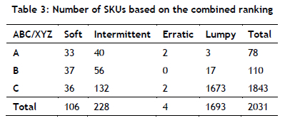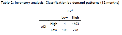 According to Table 2, 106 SKUs - equivalent to 5.22% of the total number of spare parts - were classified as soft demand; 11.23% of the SKUs (228 spare parts) were classified as intermittent demand; four of the 2 031 spare parts used in technical service were classified as erratic demand; and 83.36%, - that is, 1 693 SKUs - were classified as lumpy demand.