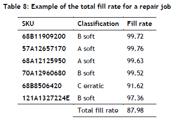 According to Table 8, this repair's fill rate would be 87.98% - a value lower than the individual fill rate of the SKU components; SKU availability enables a response to the repair request.