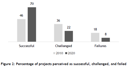 A comparison between the successful, challenged, and failed projects as perceived by the respondents in 2010 and 2020 respectively is shown in Figure 2. In both studies the majority of projects were perceived as successful. However, in 2020, seven out of ten projects were perceived as successful, compared with only half of all the projects in 2010. In both studies the minority of projects were perceived as failures. In 2020 only 8% of projects failed, and in 2010 it was only 18%. It should be kept in mind that 'success' was self-defined by the respondents. Since 2010 South Africans have increasingly been made aware of a number of gross failures, such as at Eskom, a large South African public electricity utility and the largest producer of electricity in Africa. In comparison with such recently failed projects, even mediocre projects could now be perceived by respondents as successful, which could explain the increase in the number of projects between 2010 and 2020 that were perceived to be successful. Another possible explanation could be self-reporting bias. Project managers are more prone to answer in the affirmative if asked if their project is a success out of fear that it would be a bad reflection on their skills if they said otherwise.