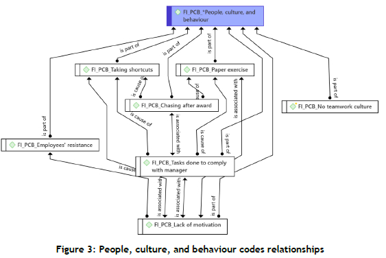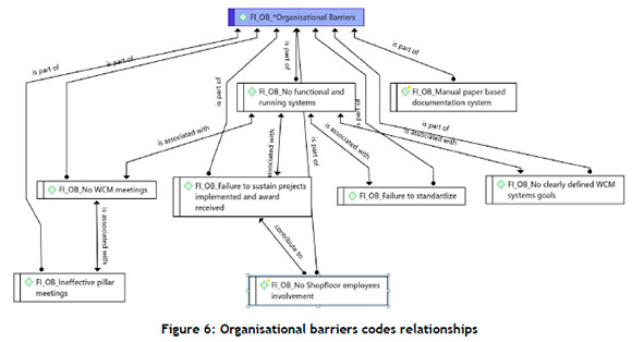 Figure 6 presents the organisational barriers codes relationships. It emerged that WCM is mainly driven to get awards, and the organisation fails to sustain the implemented projects and the awards that have been received. Although various sites have implemented WCM, the system is not functional, and there is no involvement of shop floor employees, which is characterised by low employee turnover: