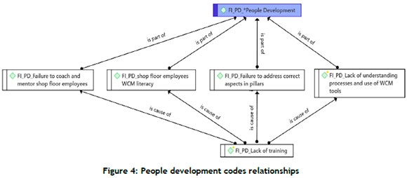 It emerged that a lack of training resulted in all the other people development inhibiting factors, as shown in Figure 4. A significant number of participants agreed that a lack of understanding of processes and the use of WCM tools contributes to the failure to implement and sustain WCM. We noticed that there was consensus among the participants about shop floor employees' lack of capacity to participate meaningfully in WCM projects: