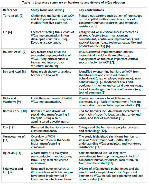 The empirical studies presented in Table 1 were conducted in various settings, such as Egypt [6, 14], South India [11], and Malaysia [10, 13]. Terra et al. [5] selected participants from different countries, with South Africa represented by only one participant from the food industry. This reveals a significant gap in empirical studies on the factors influencing WCM adoption in developing countries such as South Africa. Furthermore, the dominant research approach in the reviewed papers included literature reviews supported by other non-empirical techniques [7-9, 12] and empirical studies that used self-administered questionnaires [6, 10, 11, 14]. Terra et al. [5] used self-administered semi-structured interviews, which limited that study from securing comprehensive practitioners' perceptions of WCM implementation. The present study presents the opportunity to conduct face-to-face, in-depth, semi-structured interviews to solicit WCM practitioners' views on the factors that influence adopting and sustaining WCM in manufacturing industries.