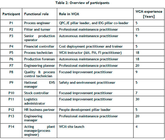 The study was undertaken in a global manufacturing company, focusing on its South African sites in various provinces and in other African countries. We conducted semi-structured interviews with practitioners practising WCM, ranging from artisans to senior management. The objective was to obtain the views of participants representing diverse organisational levels, since WCM is about total employee participation [12].