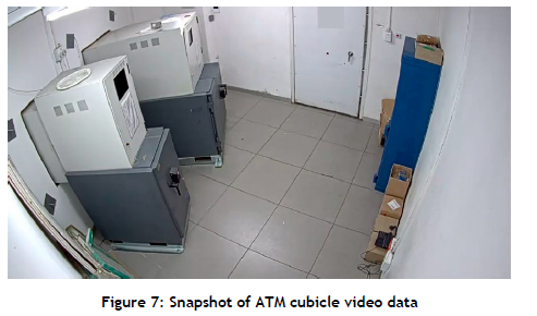 The data provided correspond to several months of video footage recorded at an undisclosed location. A snapshot of the footage showing the camera angle and layout of the specific room is shown in Figure 7. Deliberation with the industry partner resulted in the following action classes being deemed important: (1 ) EnterRoom, (2) OpenSafe, (3) CloseSafe, (4) UseComputer, (5) HandleCash, and (6) ExitRoom.