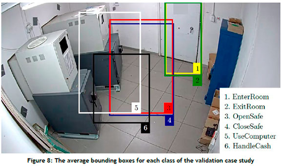 In an attempt to glean additional insight from the algorithmic performance, an average bounding box is calculated and analysed for each class, as shown in Figure 8. As expected, boxes 1 and 2 - i.e., EnterRoom and ExitRoom - are markedly similar, as are boxes 3 and 4 - i.e., OpenSafe and CloseSafe. Box 5 - i.e., UseComputer - is the most distinct box, while box 6 - i.e., HandleCash - overlaps with boxes 3, 4, and 5 (the last of them being the most notable). The best- and worst-performing classes naturally correspond to the largest and smallest overlap respectively in respect of bounding boxes.