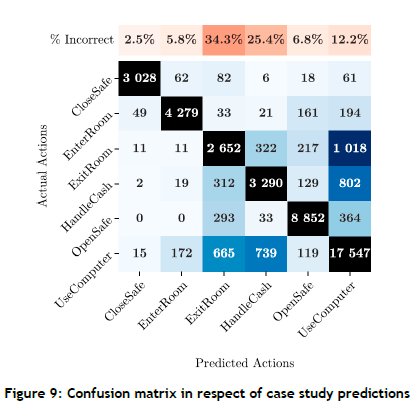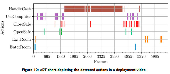Further insight can be inferred from the ADT chart, shown in Figure 10. Upon comparing the detected ADT chart with the ground truth data, it is evident that the model detects actions markedly well. The frames with the largest number of incorrect class predictions occur at frame number 5 000; and it is interesting to note that those frames, and other occurrences of incorrect detection, correspond to instances during which no labelled actions of interest occur. The model then continually searches for actions, and the model identifies different actions that do not occur at that time.