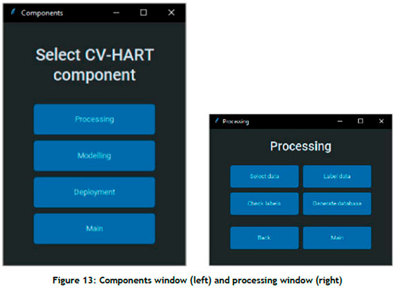 The processing component of the CV-HART comprises two sub-processes, also referred to as modules. A user can choose to input labelled or unlabelled data. A module evaluates and translates the decisions made by the user to the system regarding whether a user inputs new data or employs currently available data, and whether the data are labelled or unlabelled. If a user chooses to create a new project and to upload new data, additional information about the data is required, such as the number of action classes, the names of those action classes, and the name of the project. This information is then used to create an empty database in the correct structure for the project.